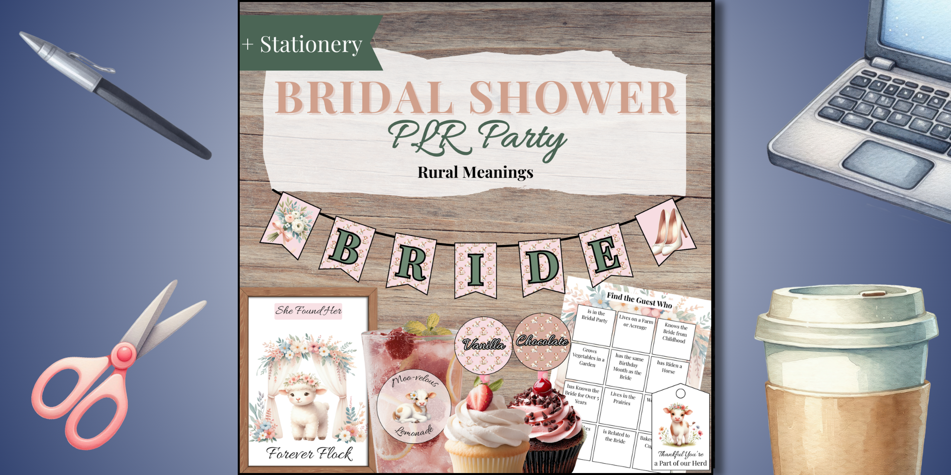 Create a countryside inspired heartfelt bridal celebration with the PLR Bridal Shower Party. It's a cohesive ready to customize Canva template. Inside, you'll find bridal shower stationery, bunting banner, cup stickers, welcome sign, cupcake toppers, favor tags, and Find the Guest Who game. With it's soft vintage feel your audience can create a breath taking event. Made for spring showers, farmyard weddings, or romantic gatherings. With PLR you can easily customize, rebrand, and make it your own to sell!
